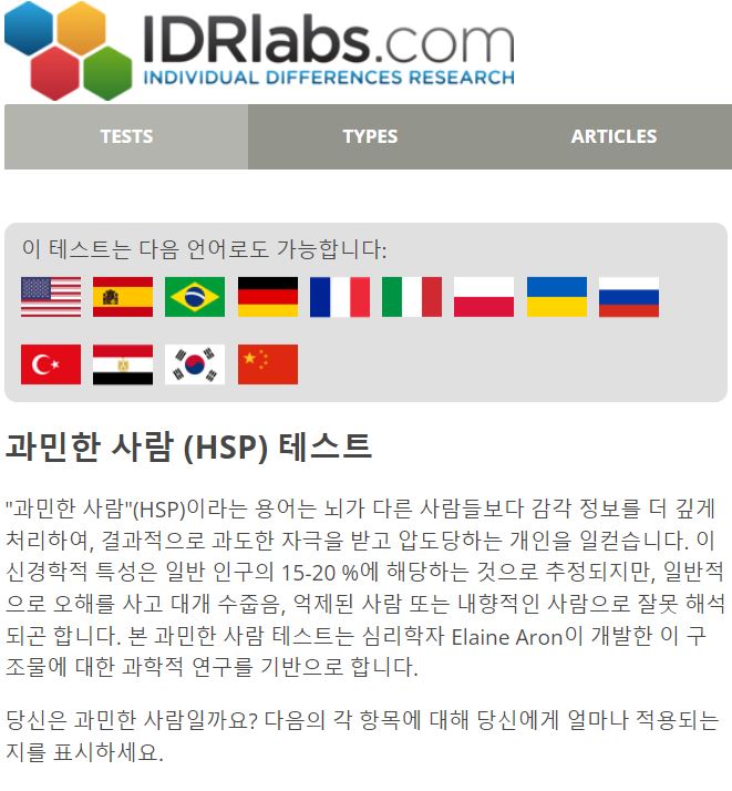 IDR Labs에서 제공하는 HSP 과민한 사람 테스트는 여러분이 HSP 성향을 가지고 있는지 확인할 수 있는 간단한 심리 테스트에요.